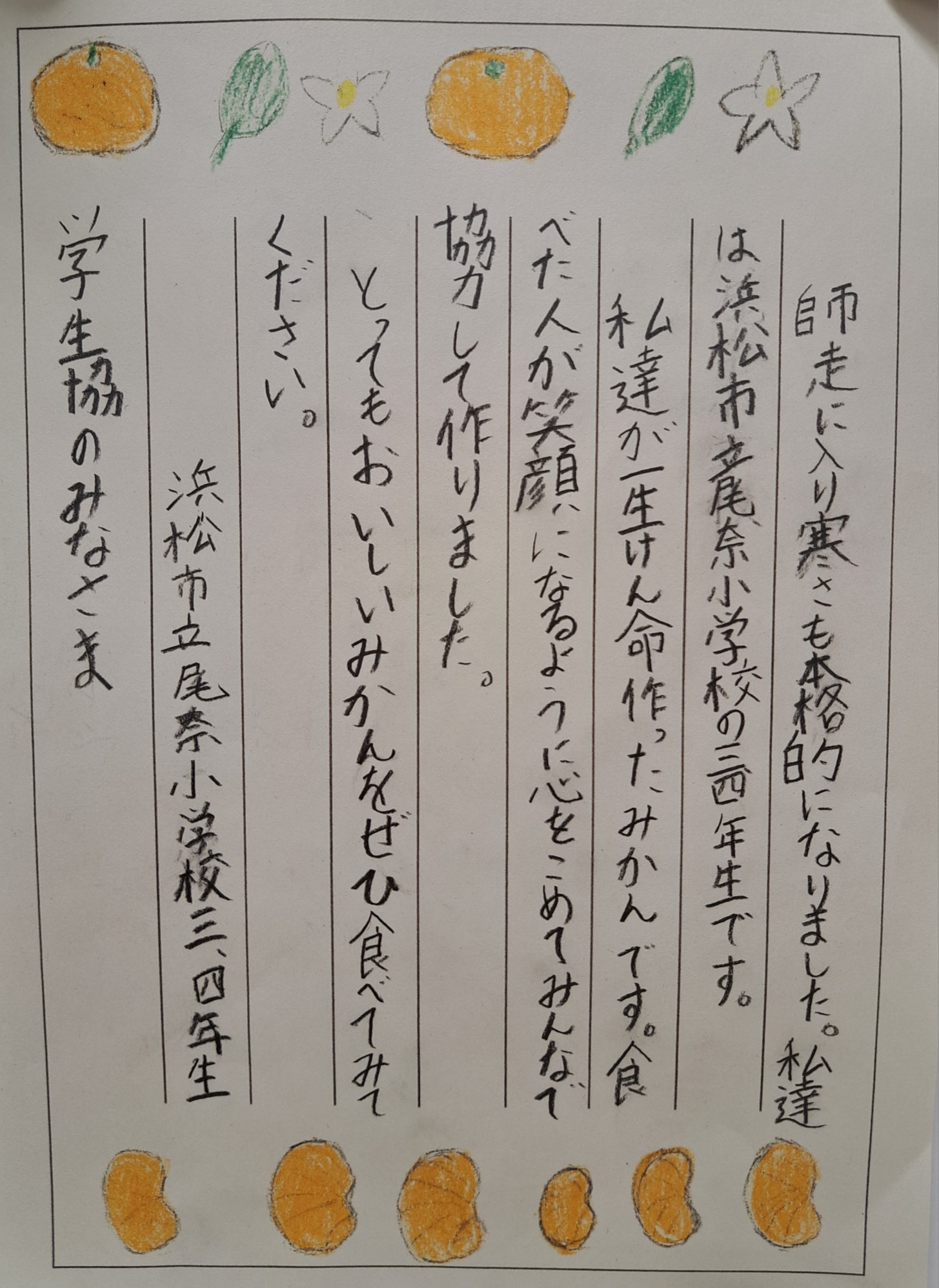 尾奈小学校のみなさんが一生懸命育てていただいたみかんを食べて、学校の勉強に使う大切な学用品をお届けします。